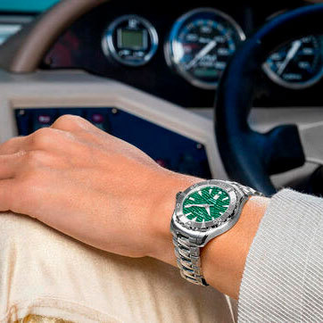 Корпус: Корпус из нержавеющей стали. Сапфировое стекло с антибликовым покрытием. Зеленый переливающийся циферблат, стальные стрелки и часовые индексы. Вращающийся безель. Диаметр 34,3 мм. Водонепроницаемость 300 метров.