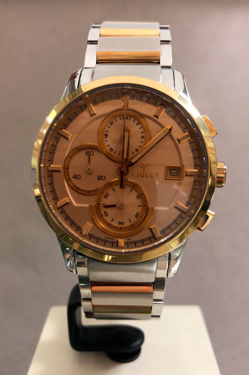 Корпус: Нержавеющая сталь в комбинации с позолотой, минеральное стекло, водонепроницаемость 50 метров.