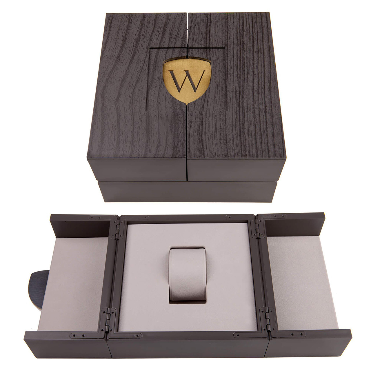 Корпус: Круглый корпус из нержавеющей стали 316L. Циферблат синего цвета, защищен устойчивым к царапинам сапфировым стеклом и украшен фирменным логотипом Wainer в положении 12 часов. Метки в виде рисок. Люминесцентные стрелки. Рифленая заводная головка с защитой. Диаметр корпуса 44 мм. Водонепроницаемость 50 метров.