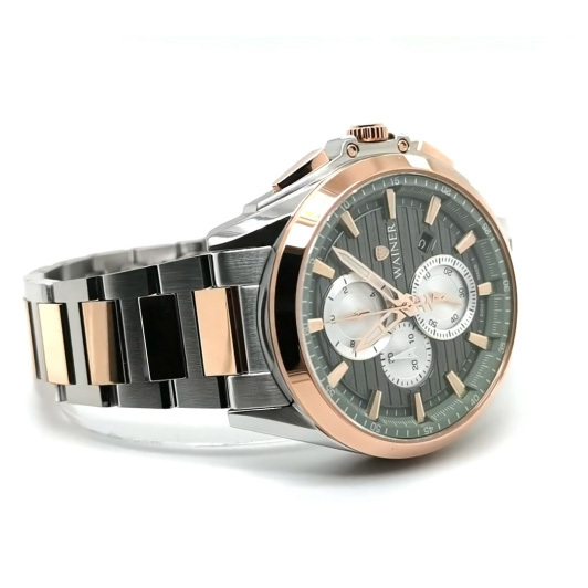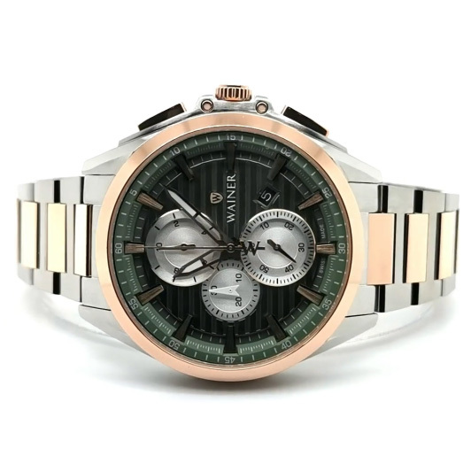 Корпус: Круглый корпус из нержавеющей стали 316L с частичным PVD покрытием. Зелёный циферблат украшен декоративным узором в виде горизонтальных линий и фирменным логотипом Wainer. Циферблат защищен прочным сапфировым стеклом. Накладные метки в виде штрихов. Люминесцентные стрелки. Рифленая заводная головка с защитой. Диаметр корпуса 43 мм. Водонепроницаемость 50 метров.