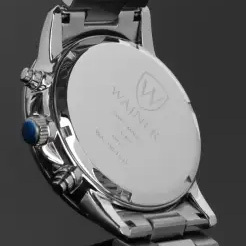 Корпус: Круглый корпус из нержавеющей стали 316L. Циферблат чёрного цвета украшен фирменным логотипом Wainer в положении 12 часов. Метки в виде рисок. Минеральное стекло с сапфировым напылением. Рифленая заводная головка с защитой. Диаметр корпуса 44 мм. Водонепроницаемость 50 метров.