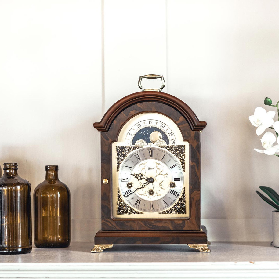 Материал: Настольные часы, сделаны из отборной древесины. Красивый металлический циферблат с латунной отделкой углов и лунным календарем. Модель имеет латунную ручку и застекленные боковые стороны корпуса.