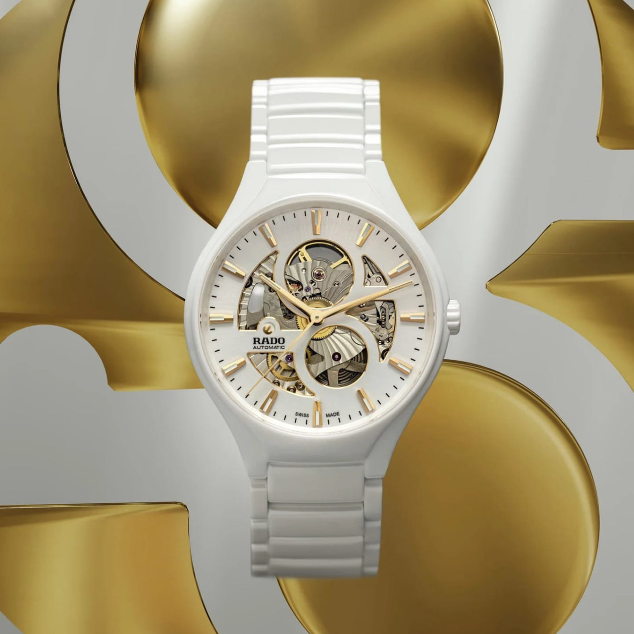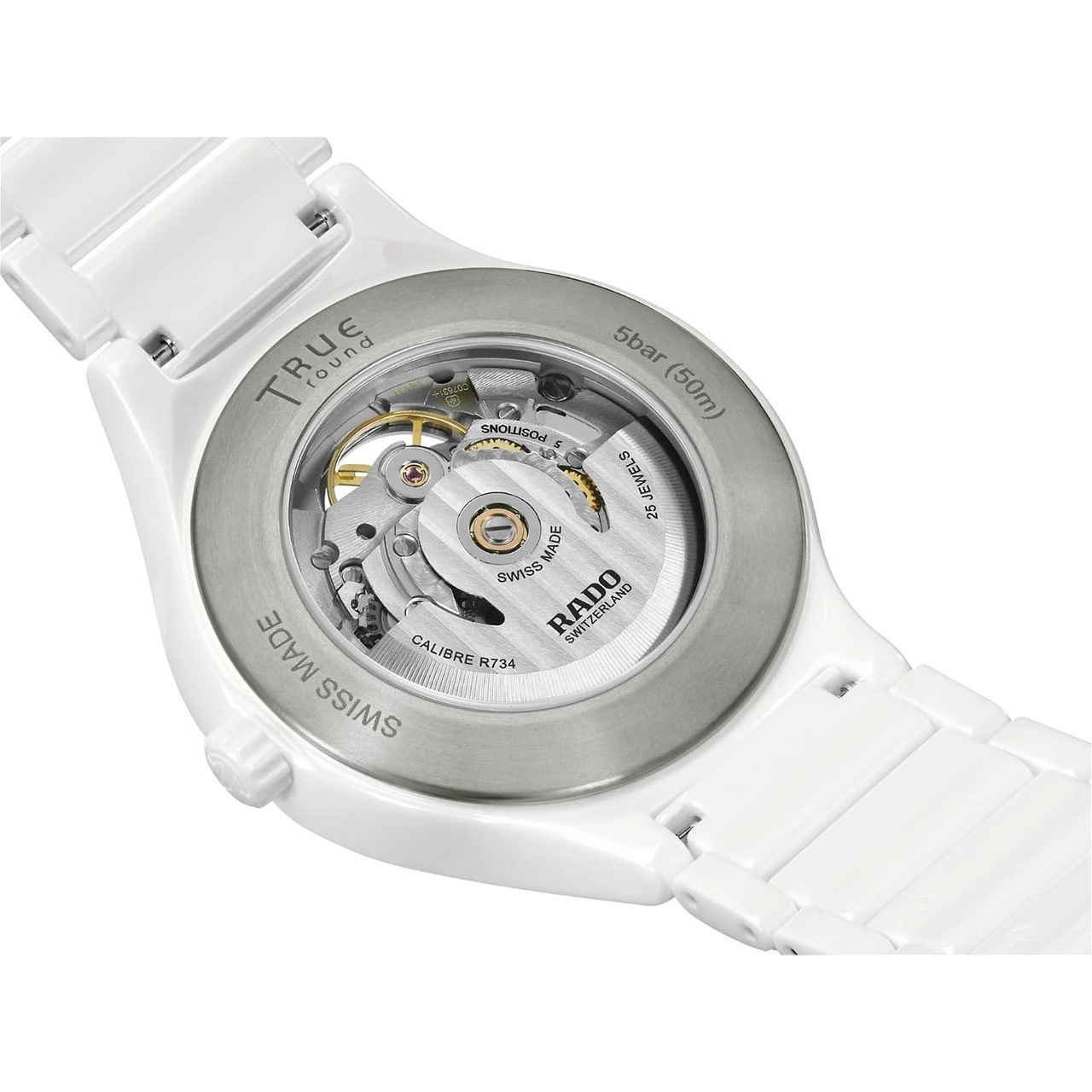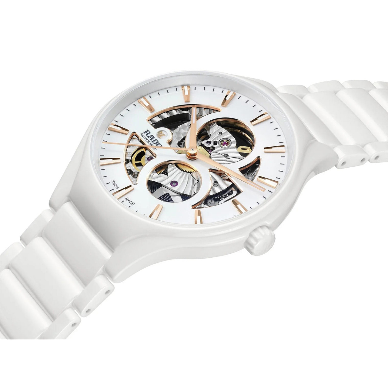 Корпус: Полированный белый высокотехнологичный керамический моноблочный корпус. Часы имеют белый циферблат с солнечными лучами со скосами цвета розового золота и серую печатную минутную шкалу. Стрелки и часовые индексы позолоченные с люминесцентным покрытием по технологии SuperLumiNova®. Сапфировое стекло имеет антибликовое покрытие, уменьшающее отражение света для лучшей читаемости показателей. Прозрачная задняя крышка из сапфирового стекла и титана. Диаметр 40 мм. Водостойкость 50 м.