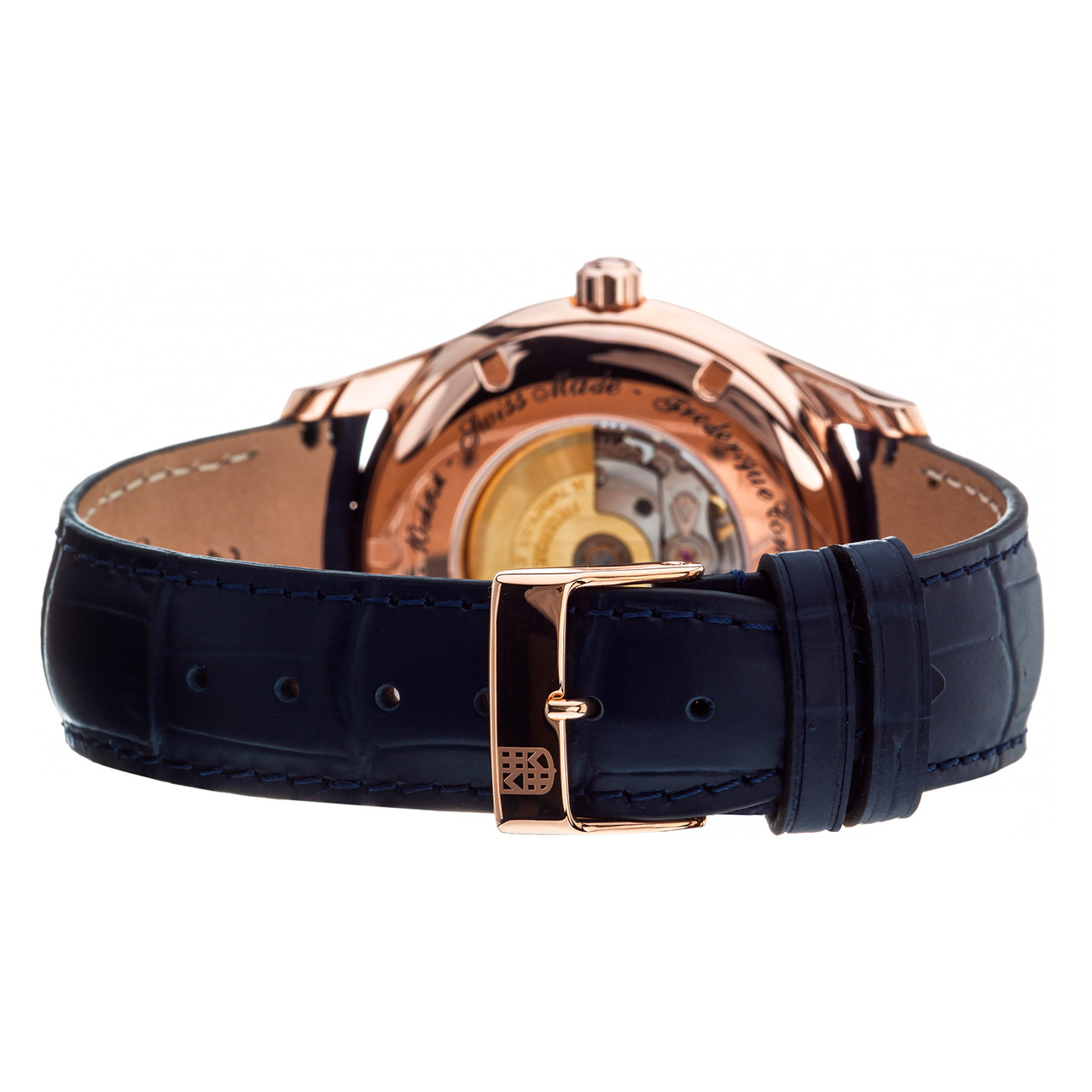 Ремешок: Ремешок тёмно-синего цвета из высококачественной кожи с тиснением под аллигатора. Ремешок вплотную прилегает к корпусу и имеет ширину 23 мм. Литая классическая застежка из нержавеющей стали и гравировкой с эмблемы часовой марки.