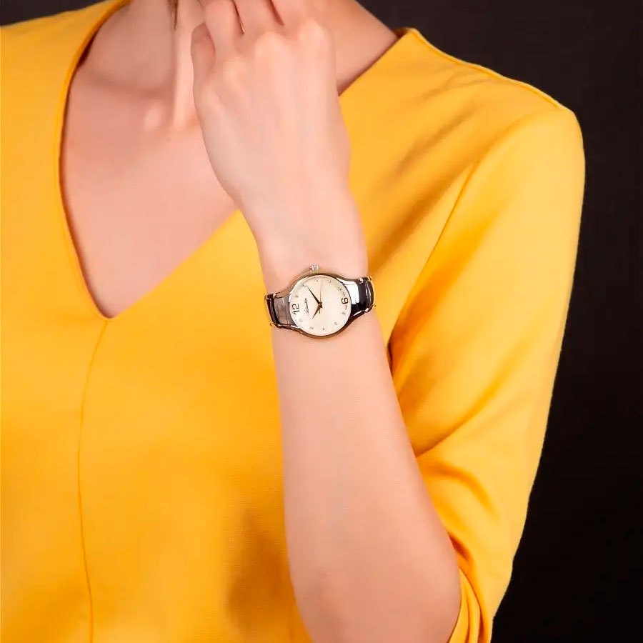 Корпус: Круглый корпус выполнен из полированной нержавеющей стали с PVD покрытием желтого золота. Циферблат цвета шампань украшен 10 цирконами. Минеральное стекло с сапфировым покрытием. Диаметр корпуса составляет 33 мм, толщина 7 мм. Водостойкость WR 30 (мытье рук, дождь).