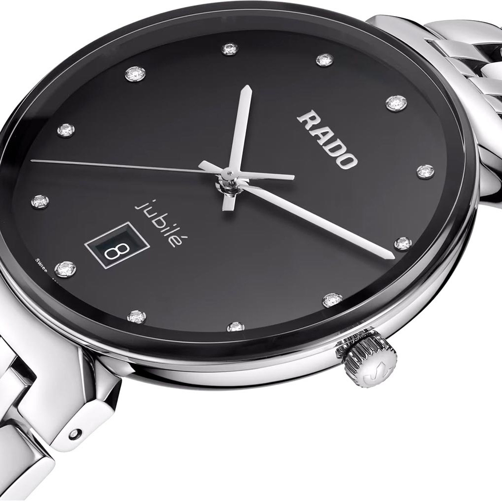 Корпус: Корпус изготовлен из полированной нержавеющей стали 316L. Черный циферблат с 12 бриллиантами (4 бриллиантами - 0.032 ct. и 8 бриллиантами - 0.030 ct), украшенный логотипом «jubilé», идеально сочетается с стрелками, покрытыми родием в стиле Baton. Часы оснащены изогнутым сапфировым стеклом со скошенными краями. Рифленая заводная головка. Диаметр: 38 мм. Водостойкость: 50 м.