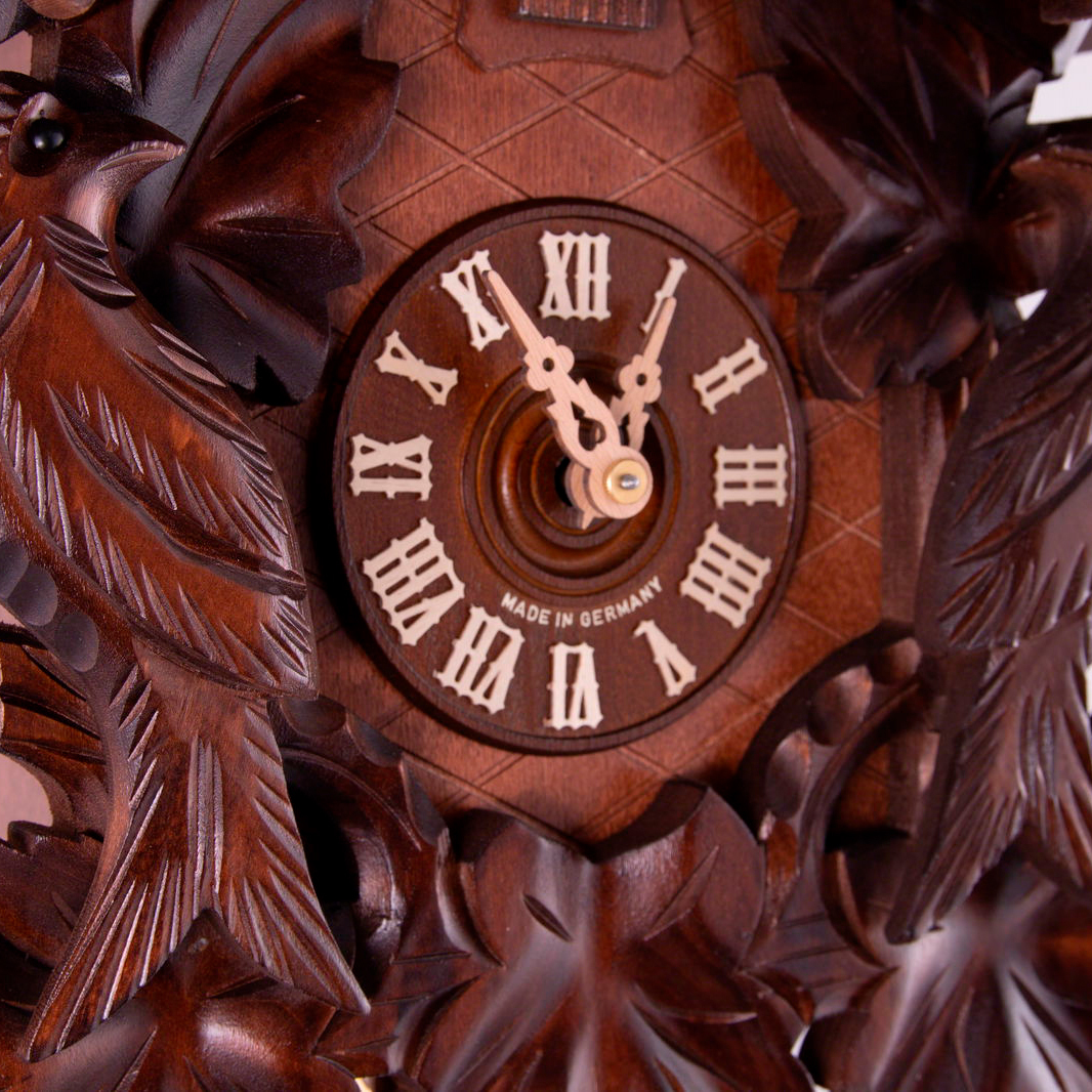 Механизм: Механические часы с кукушкой, которые работают от гирь на цепной тяге. Сделан на фирме SBS-Feintechnik GmbH & Co. KG Германия. Запас хода на 8 дней. Ручное отключение звука. В каждые пол часа кукушка появляется из своего домика, наклоняется и воспроизводит звук кукушки (ку-ку) один раз, в каждый полный час она кукует столько раз сколько показывают стрелки на часах. Одна гиря в данных часах отвечает за ход часового механизма, а вторая за механизм кукушки.