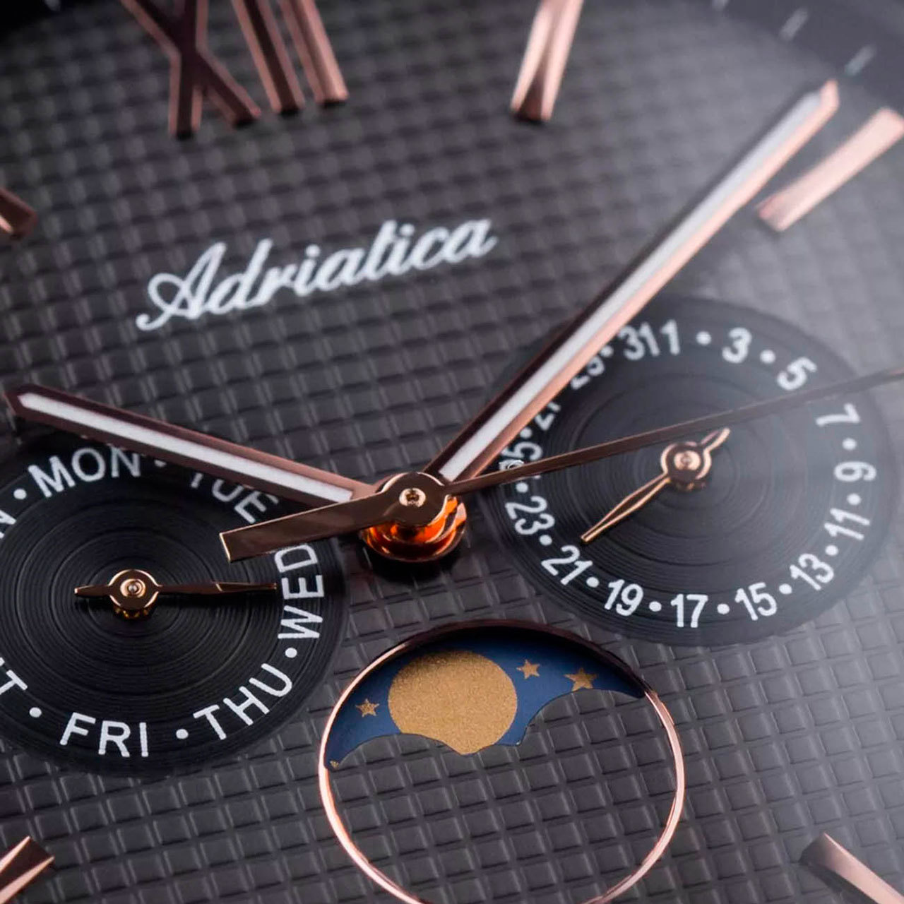 Функции: Центральные часовая, минутная и секундная стрелки. Индикатор фазы Луны. День недели и число отображаются на отдельных циферблатах.