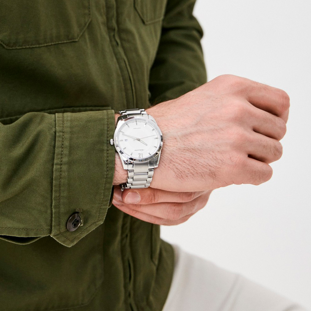 Ремешок: Браслет выполнен из нержавеющей стали. Браслетная раскладывающаяся застежка с гравировкой логотипа.
