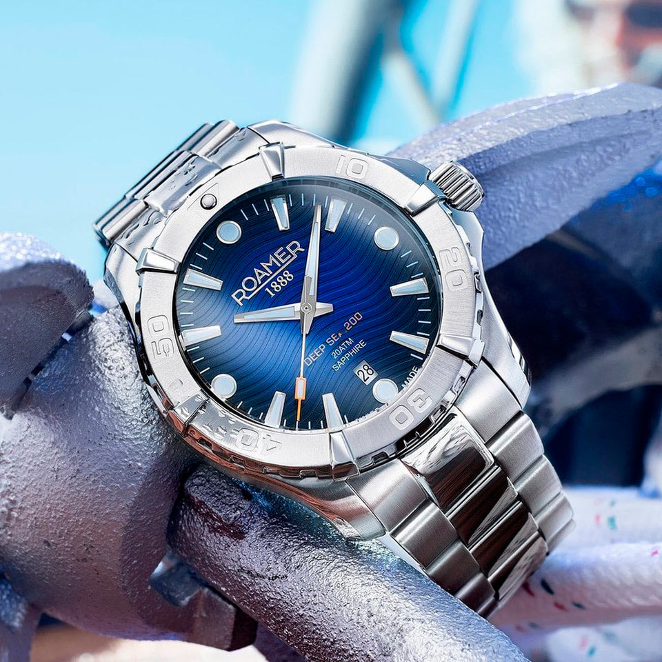 Корпус: Нержавеющая сталь, вращающийся безель. Синий циферблат с волнистой текстурой . Серебристые стрелки и часовые индексы с люминесцентным покрытием. Сапфировое стекло с антибликовым покрытием. Водонепроницаемость: 200 метров. Диаметр: 43 мм.