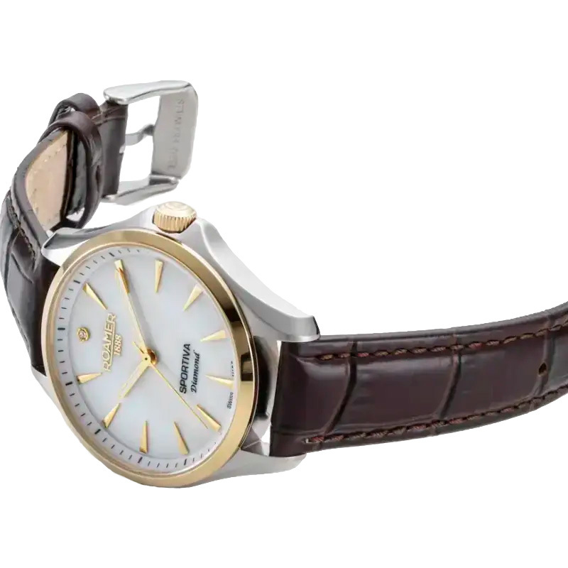 Корпус: Корпус выполнен из высококачественной нержавеющей стали 316L с полировкой и матовой шлифовкой - сатинированием с частичным IP покрытием. Перламутровый циферблат белого цвета декорирован 1 бриллиантом, золотистые стрелки и часовые индексы. Стрелки с люминесцентным покрытием для оптимальной разборчивости в условиях низкой освещенности. Сапфировое стекло с антибликовым покрытием. Диаметр: 36 мм. Водозащита: 50 м.