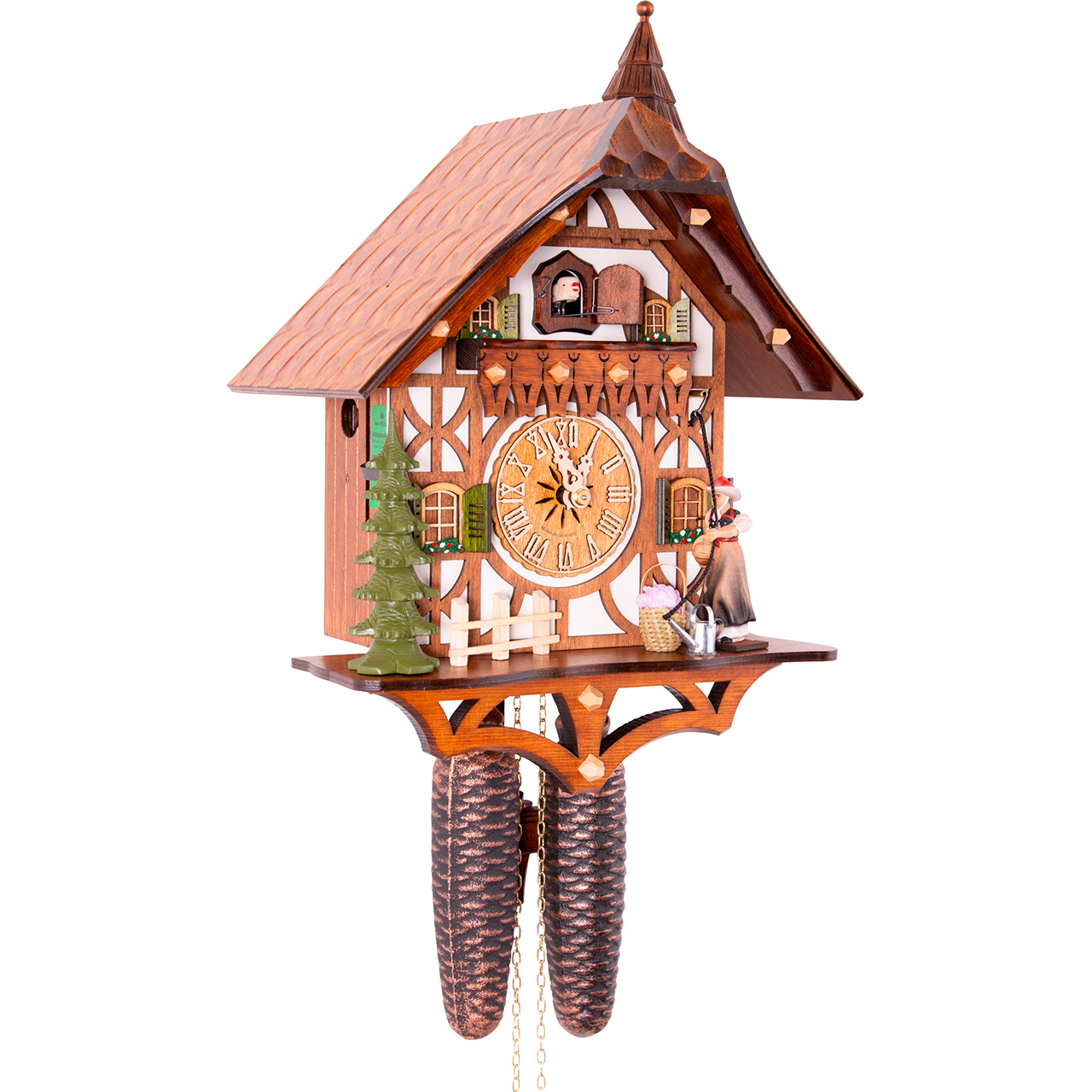 Механизм: Механические часы с кукушкой, которые работают от гирь на цепной тяге. Сделан на фирме SBS-Feintechnik GmbH & Co. KG Германия. Шварцвальдский дом со звонарём. Запас хода на 8 дней. Ручное отключение звука. В каждые пол часа кукушка появляется из своего домика, наклоняется и воспроизводит звук кукушки (ку-ку) один раз, в каждый полный час она кукует столько раз сколько показывают стрелки на часах. Одна гиря отвечает за ход часов, вторая за работу механизма кукушки и звоноря.