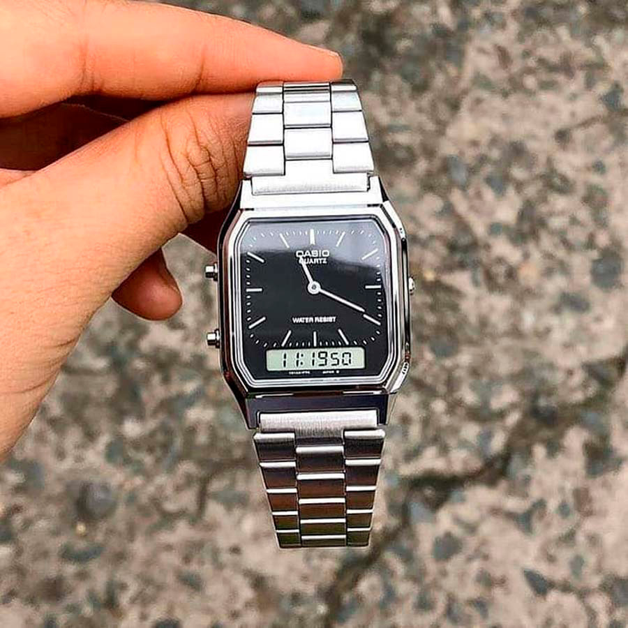 Корпус: Корпус часов выполнен из пластика с хромированным покрытием. Циферблат чёрного цвета вокруг дисплея. Дисплей серого цвета, цифры чёрного. Акриловое стекло. Габаритные размеры: 33x29x7 мм. Водозащита: 30м.