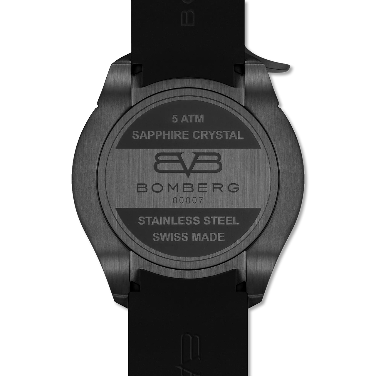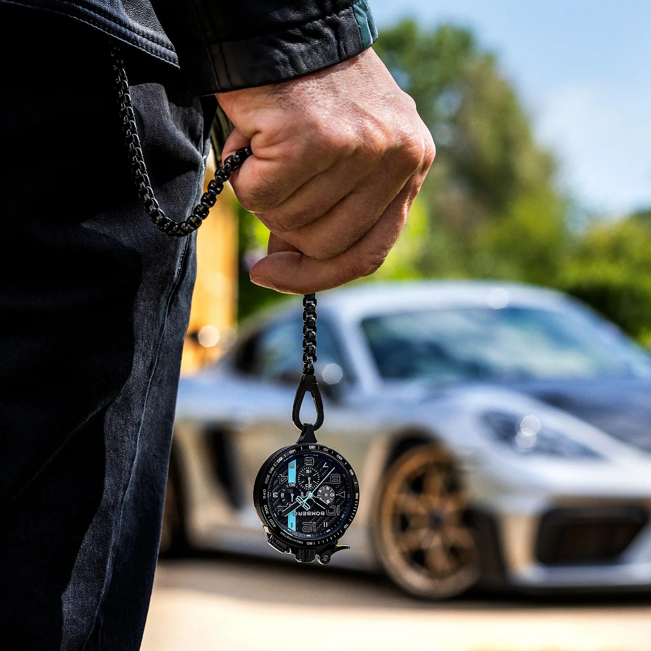 Корпус: Круглый корпус выполнен из нержавеющей стали марки 316L. Стойкое к царапинам PVD покрытие черного цвета. Черный алюминиевый безель тахометра. Циферблат из углеродного волокна с черными и бирюзовыми полосами. Уникальный дизай с завинчивающейся заводной головкой в положении «12 часов», кнопкой в положении «1» и рычагом в положении «11» вдохновлен искусством автоспорта и гонок. Аппликация часовых индексов и стрелки с покрытием Super-Luminova®. Сапфировое стекло с антибликовым покрытием. Диаметр корпуса 45 мм, толщина - 13 мм. Водостойкость 50 метров.