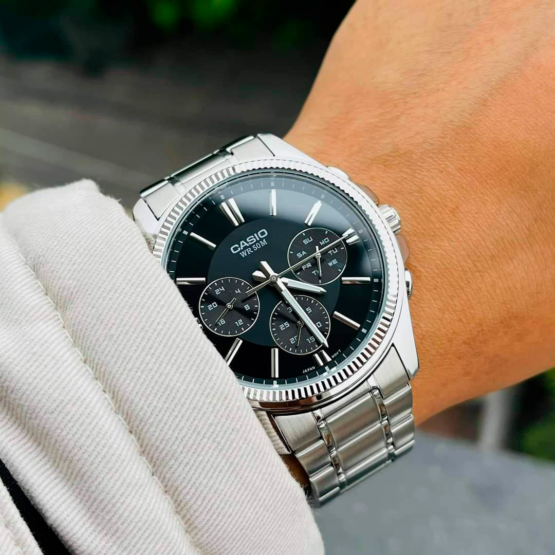 Функции: Центральные часовая, минутная и секундная стрелки. Дата. 12-ти и 24-х часовой формат времени. День недели.