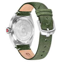 Корпус: Стальной винтажный корпус с шлифованным модифицированным безелем с плоским ребристым краем в виде монеты. Циферблат с пескоструйной отделкой дополнен фирменным логотипом Swiss Military Hanowa. Накладные метки в виде арабских цифр. Заостренные прямоугольные стрелки в стиле Baton. Метки и стрелки с люминесцентным покрытием, которое светится в темноте после непродолжительной зарядки на свету. Сапфировое стекло устойчивое к появлению царапин, обладающее высокой прозрачностью. Рифленая заводная головка в пилотском стиле, украшена фирменным логотипом. Завинчивающаяся задняя крышка. Диаметр 41 мм. Водонепроницаемость 100 м.