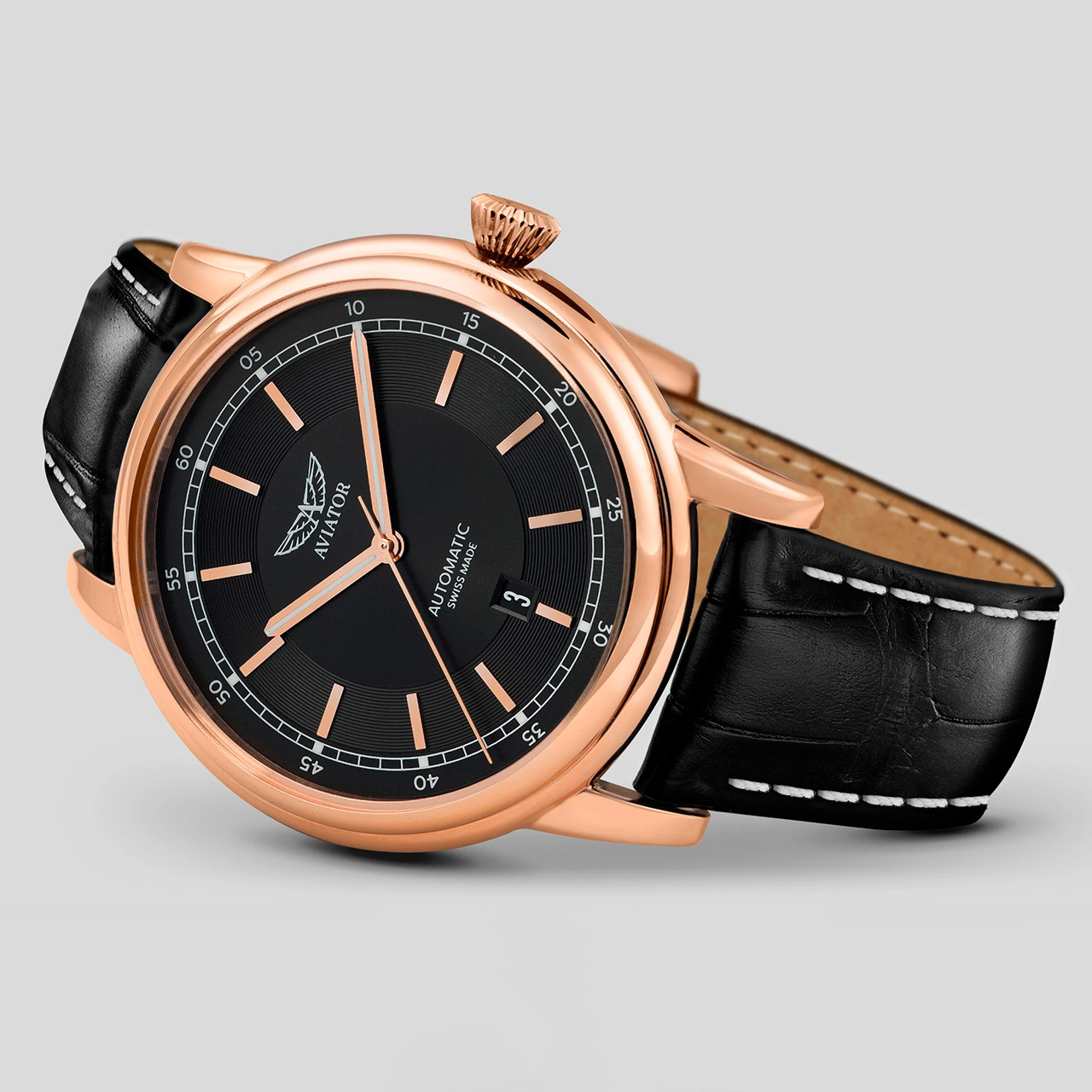 Корпус: Нержавеющая сталь марки 316L с розовым PVD покрытием. Объемный циферблат чёрного цвета с различной финишной обработкой: в центральной части шлифовка в стиле «солнечные лучи», окруженная гильошированием в виде тонких концентрических линий. Стрелки и часовые индексы покрыты люминесцентным составом SuperLuminova. Сапфировое стекло с антибликовым покрытием. Переводная коронка с двойным уплотнителем для дополнительной защиты от попадания воды внутрь корпуса. Задняя крышка с прозрачным окном из сапфирового стекла имеет винтовое соединение с корпусом. В оформлении задней крышки использована стилизация под один из инструментов управления из кабины самолета Douglas DC-3. Гравировка с градусами на крышке корпуса и стрелка на роторе автоподзавода имитируют функцию угла перекладки руля, которая контролирует положение передней и задней частей самолета. Водонепроницаемость 100 метров. Диаметр 45 мм.