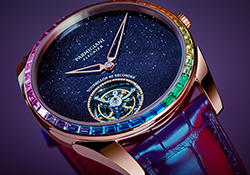 Frederique Constant выпускает одно уникальное издание своих успешных часов Tourbillon Perpetual Calendar Manufacture из 18-каратного розового золота с синим оттенком метеоритного скелета на циферблате с сердцебиением. Владельцу часов открывается взор на сложную механику часов.