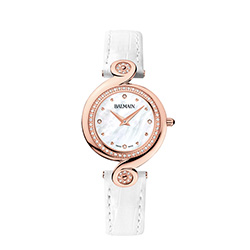 10. Balmain Kerria B4179.22.83 Стальной полированный корпус с розово-золотым PVD-покрытием. Белый перламутровый циферблат с центральными гранёными стальными, с розовой позолотой, стрелками часов и минут, с четырьмя бриллиантами в виде условных индексов, с фирменным розово-золотым узором в форме арабески. Белый ремешок из натуральной кожи с застёжкой из стали с розовой позолотой. |