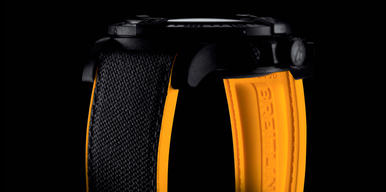 1. Breitling Avenger Hurricane XB1210E4/BE89-257S: матовый чёрный корпус из инновационного полимера «Breitlight®»; чёрный циферблат; ремешок «Diver Pro» из жёлтого каучука и высокопрочного текстиля «Military» цвета антрацит с раскладывающейся застёжкой.