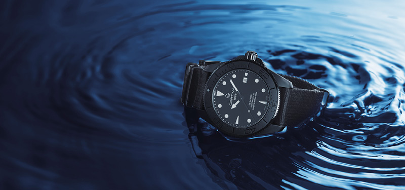 Поднимаясь на поверхность из темных океанских глубин… Новые часы DS Action Diver 43 мм от Certina полностью выполнены в черном цвете. Как истинные дайверские часы они не боятся никаких глубин благодаря водонепроницаемости до 300 метров и идеально подходят для любых приключений – на суше и под водой. Кроме того, черный корпус из нержавеющей стали, вращающийся безель с матовой черной керамической вставкой и ремешок NATO темного цвета превращают эти элегантные часы в настоящий образец стиля.