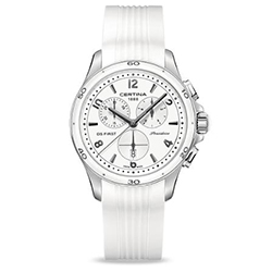 | 1. Модель «Certina DS First Lady Ceramic – Chronograph» C030.217.17.017.00 Стальной корпус, плоский безель из белой керамики, белый циферблат, центральные стрелки, стрелки счётчиков хронографа, условные индексы и арабские цифры чёрного цвета, каучуковый ремешок белого цвета. | |