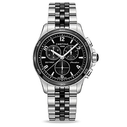| 4. Модель «Certina DS First Lady Ceramic – Chronograph» C030.217.11.057.00 Стальной корпус, плоский безель из чёрной керамики, чёрный циферблат, центральные стрелки, стрелки счётчиков хронографа, условные индексы и арабские цифры белого цвета, стальной браслет с центральными звеньями из чёрной керамики. | |