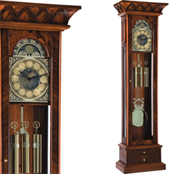 Эти механические часы могут быть сделаны из орехового или черного дерева с глянцевой полировкой, и сочетают в себе элегантность классических и изысканность современных часов. Механические часы Hermle W0058 имеют изящные шкивы и гири, а также шикарный циферблат, отображающий день недели, число, месяц и классическую фазу луны. Эта модель представляет собой великолепный пример ультрасовременного дизайна настенных часов. Механизм с восьмидневным заводом имеет спиральный гонг, анкер Грэхема, автоматическую синхронизацию боя. Никелевый маятник.
