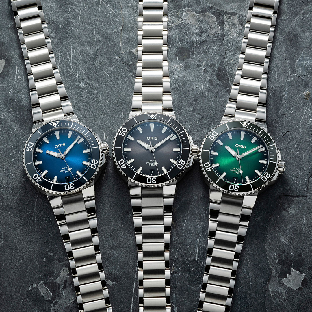 Впервые Oris Calibre 400 используется в модели Aquis Date с уменьшенным корпусом 41,5 мм. Дайверские часы предлагаются с циферблатом синего, антрацитового или зеленого цвета.