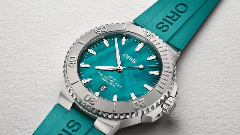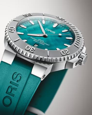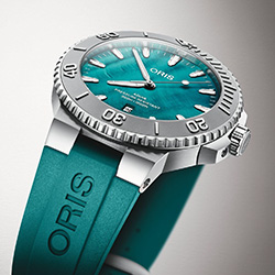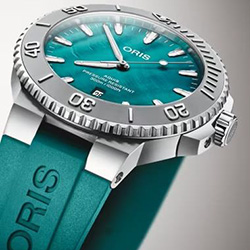 Модель основана на культовой линейке Oris Aquis Date. Корпус диаметром 43,5 мм выполнен из нержавеющей стали, а циферблат повторяет переливы раковины устрицы: оттенок морской волны живой, глубокий и меняющийся при свете. Модель выпущена ограниченной серией 2000 экземпляров, подчеркивая значимость проекта и ценность каждой единицы.