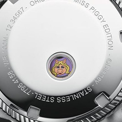 Корпус диаметром 34 мм выполнен из нержавеющей стали, а розовый циферблат украшен бриллиантом багетной огранки на отметке «12 часов». Сквозь заднюю крышку с гравировкой можно увидеть миниатюрный портрет Мисс Пигги - кокетливый акцент для коллекционеров и поклонников стиля.