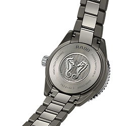 Взявшая свое начало в природе и эволюционировавшая благодаря инновациям и изобретениям людей, высокотехнологичная керамика Rado очень легкая несмотря на свою невероятную прочность, приятная на ощупь, а ее цвет настолько глубок, что обеспечивает непревзойденную устойчивость к появлению царапин. За счет использования корпуса-моноблок обеспечивается стабильность часов, и одновременно снижаются внешние размеры и вес модели для еще большего комфорта ее владельца. Детали часов Captain Cook хорошо узнаваемы визуально. Среди них массивный и удобный безель со вставкой из полированной высокотехнологичной керамики, выгравированные и обработанные белым Super-LumiNova цифры, расположенный на 60-минутной позиции треугольник. С обратной стороны — завинчиваемая крышка часов из титана с круговой полировкой и изображением двух морских коньков на фоне морского рельефа, которая напоминает о моделях родом из 60-х и водонепроницаемости изделия, подтвержденной сертификатом ISO 6425. Под крышкой расположен автоматический часовой механизм калибра R763 с 25 камнями, отрегулированный в пяти положениях.