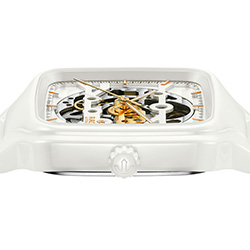 Три новых образца, выполненных из фирменной черной, плазменной и белой моноблочной высокотехнологичной керамики, представляют собой двухуровневый циферблат с вырезанной верхней пластиной, откуда открывается захватывающий вид на точно скелетонированный механизм с автоподзаводом R808. В черной и плазменной версиях антрацитовое покрытие мостика минутного колеса и основной пластины дополняет никелевый цвет нижней пластины циферблата и его декор в стиле Côtes de Genève. Точно также золотистый центральный колесный мост в белой версии привлекает внимание и приглашает зрителя исследовать сложную красоту внутреннего механизма.