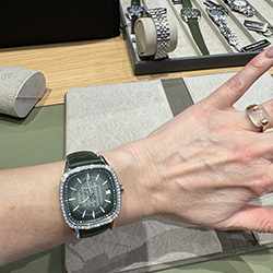 Также в конгресс-центре Watches and Wonders мы встречались с представителями Raymond Weil. У этого бренда модели очень необычной формы, похожей на “подушечку”, смотрятся интересно. Их выполнили в том числе в трендовом зеленом и голубом цвете, и надо сказать, что и в этих расцветках часы хорошо сочетаются с деловым дресс-кодом.
